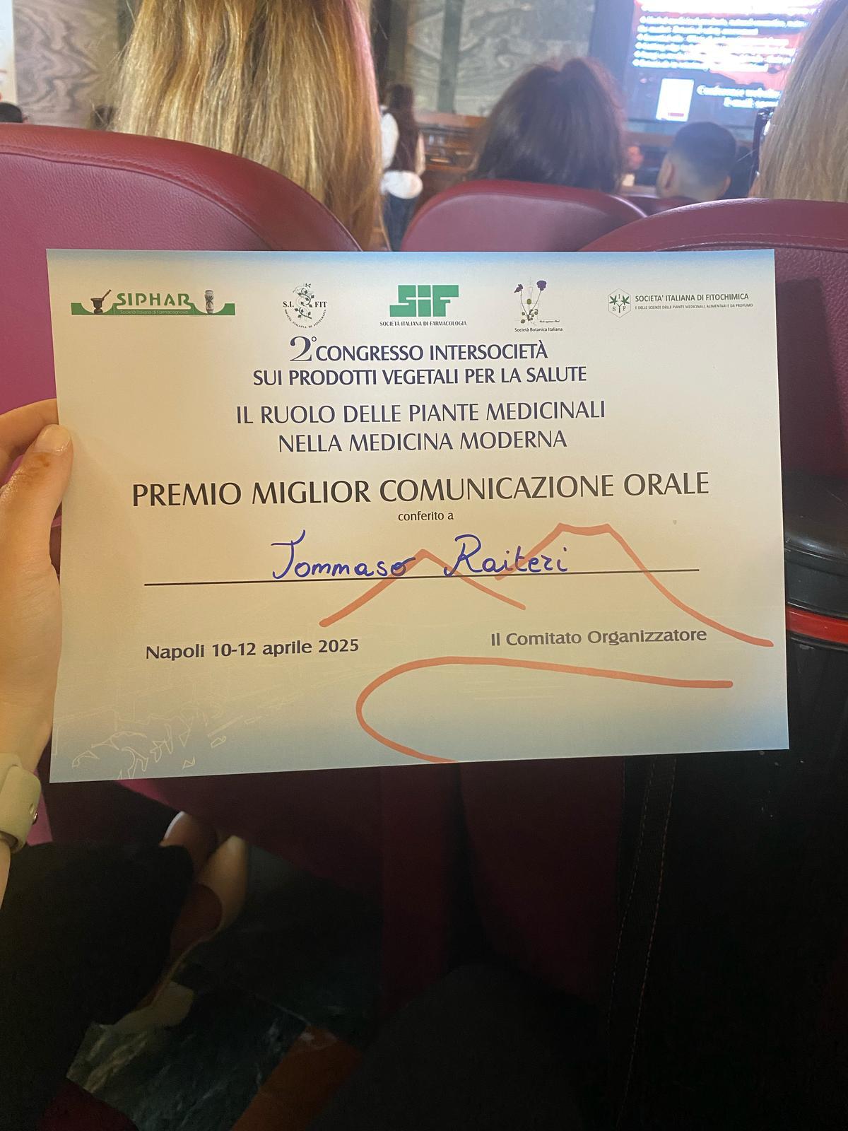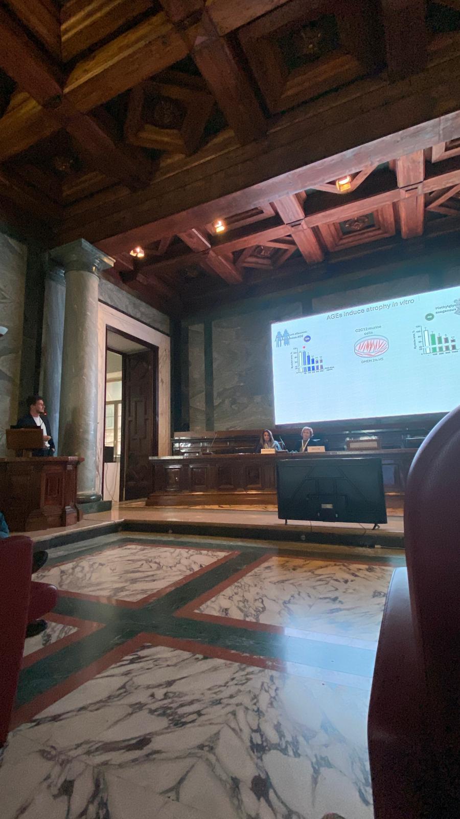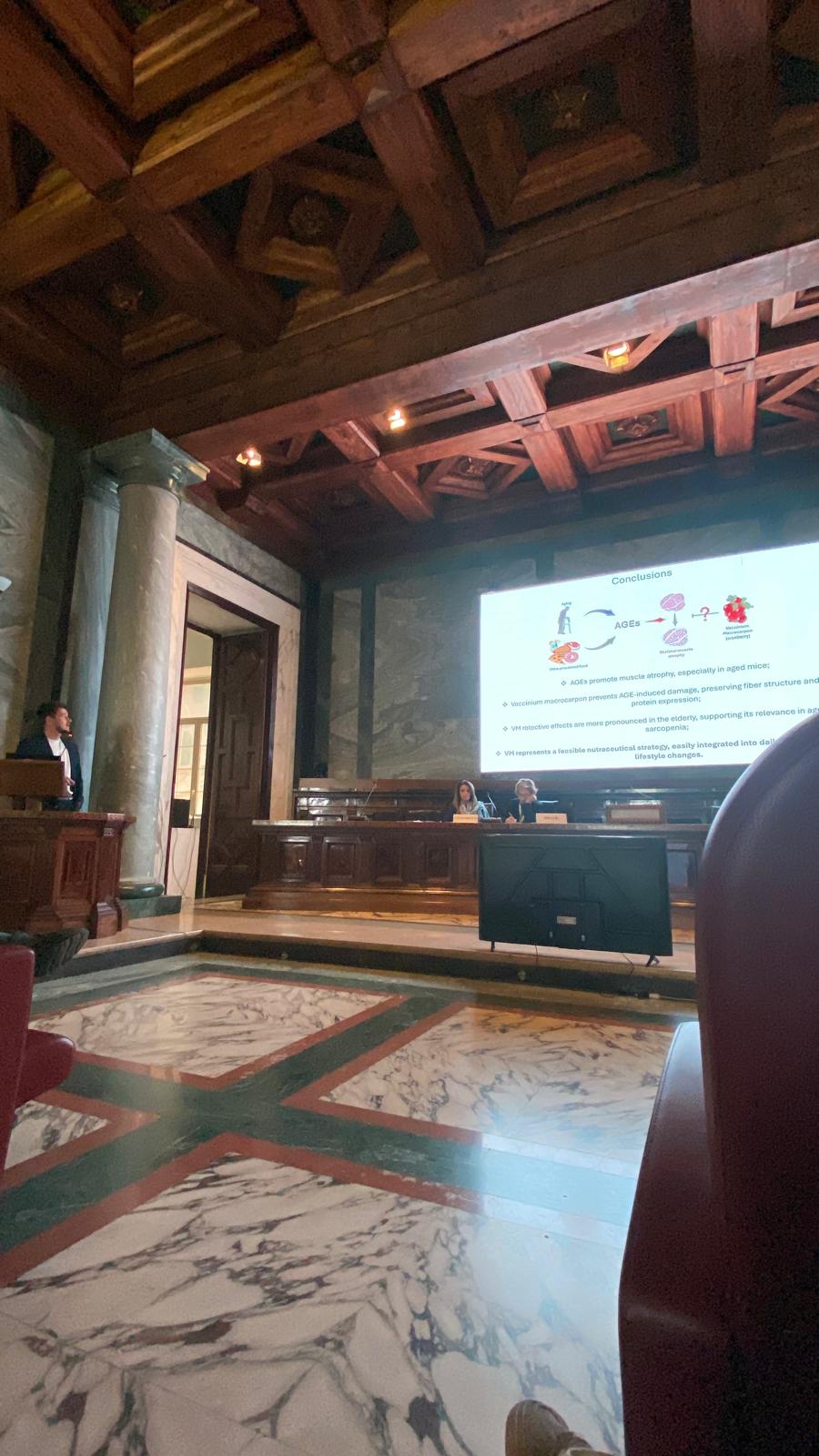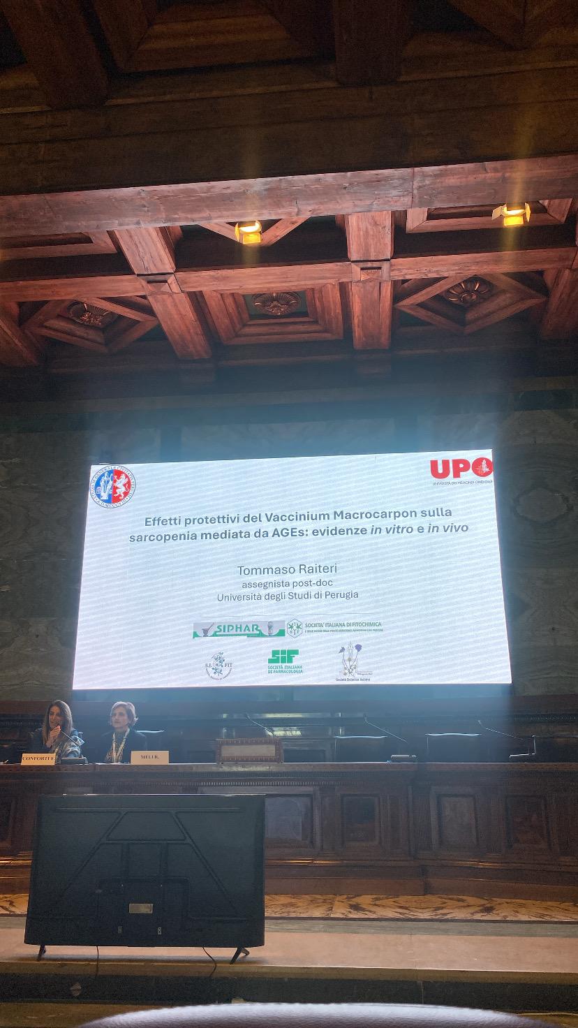 The oral presentation by Dr. Tommaso Raiteri, titled “Effects of Vaccinium Macrocarpon on AGEs-mediated sarcopenia: in vitro and in vivo evidence”, was successfully held in Naples on April 10, 2025, at 4:00 PM, at the Federico II Conference Center, located at Via Partenope 36.